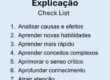 - Check list … resumir, memorizar, listar atividades, recursos, pontos de atenção, paa garantir corretismo, consistência e capacidade das atividaes e tarefas.