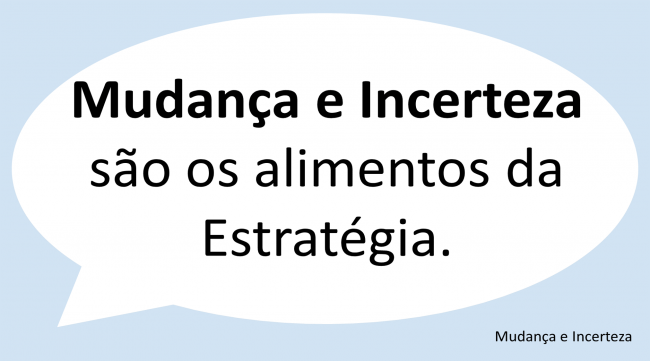Mudança e Incerteza são os alimentos da Estratégia. A incerteza como tudo, muda! A noção de estratégia sem incerteza é vazia … idem para mudança. No passado, a incerteza estava associada a poucos fatos externos de natureza imprevisível que se intrometiam em uma empresa ou país. A incerteza hoje tem uma qualidade marcadamente diferente: fenômenos…