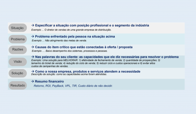 O o exemplo de plano de referência, apresenta o formato de sumário executivo para Justificar Valor. Foca em 6 passos ou componentes: Situação > Problema > Razões > Visão > Solução > Resultados. É um Plano de Referência ou “script de alto nível”, que tem vários benefícios, em destaque: lógica – pensar e apresentar na…