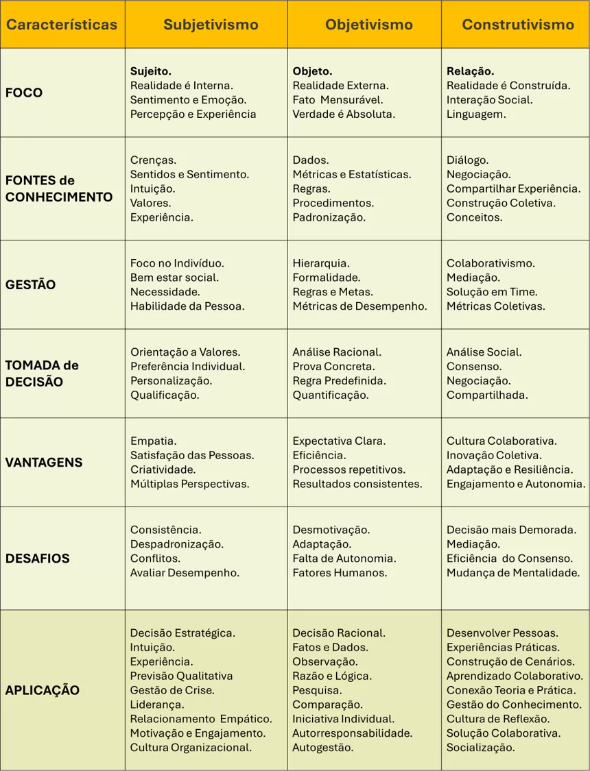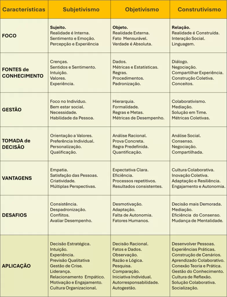 A tabela da figura provê uma visão matricial de 3 correntes filosóficas muito frequentes e aplicadas nas empresas … subjetivismo, objetivismo e construtivismo.