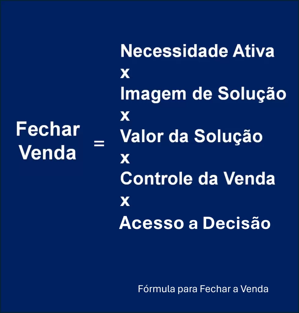 - Deve ser visualizado e analisado de forma clara, tal como explicitado e modelado na fórmula do fechamento da venda e dependente da anecessidade ativada, valor percebido, imagem de solução, controle da venda e poder de decisão.