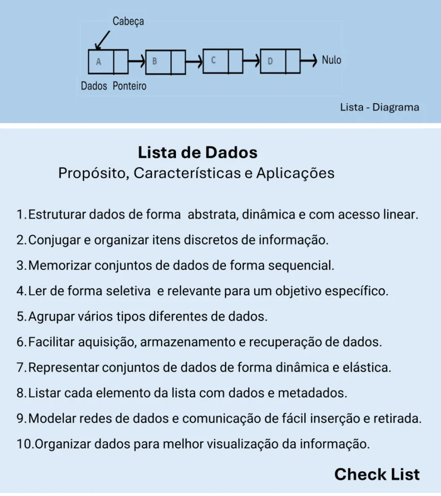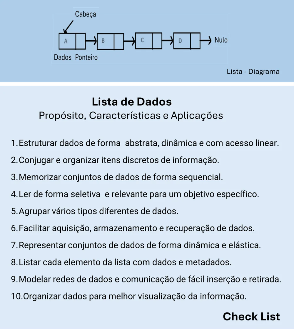 O esquema e check list da figura descreve propósito, características e aplicações das listas.