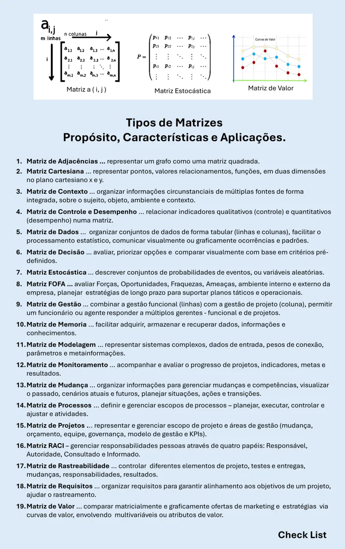 O Check List – Tipos de Matrizes, resume diferentes propósitos e aplicações da estrutura e processamento matricial nas empresas.