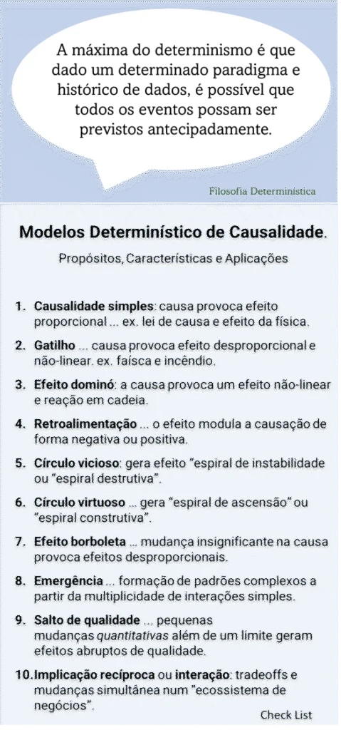 Vários modelos de causalidade são utilizados para explicar e prever de forma científica os fenômenos da vida e da empresa, tais como explicitados no check list da figura.
