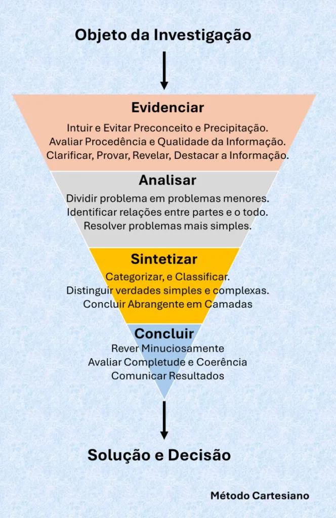O método de raciocínio proposto por Descartes pode ser resumido em quatro partes distintas: evidenciar, analisar, sintetizar e concluir.
