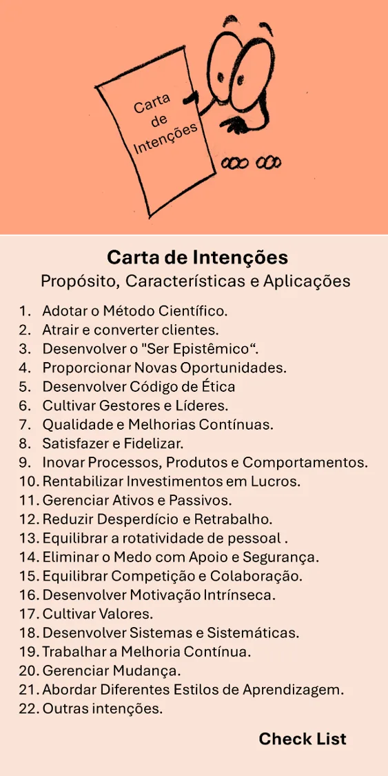Ver o check list Carta de Intenções … um mapa teórico metacognitivo para refletir sobre intenções. … para que “todos” na empresa possam compreender e buscar a melhoria contínua, com o objetivo de que “todos” saiam ganhando.