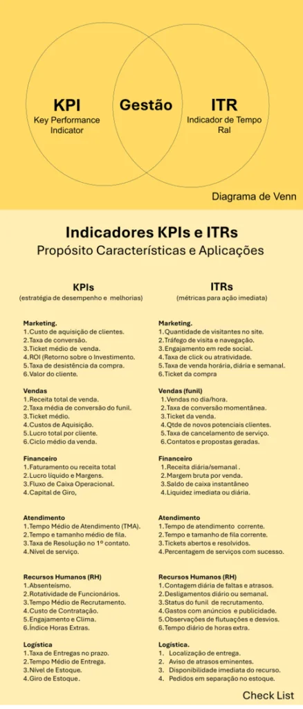 Veja a figura, diagrama de venn e tabela formada por dois check lists de exemplos de KPIs e ITRs