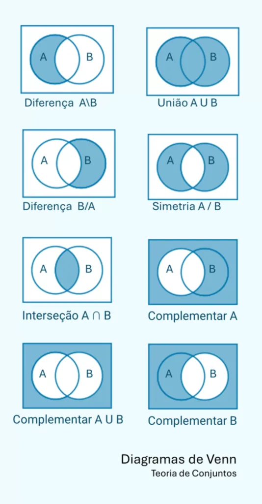 A teoria de conjuntos representa regras e relacionamentos lógicos (pertencimento, enumeração, intersecção, união, negação, complementaridade, simetria), que aprofunda a capacidade de análise, compreensão, significação de dados e informação de conjuntos de dados (amostras).
