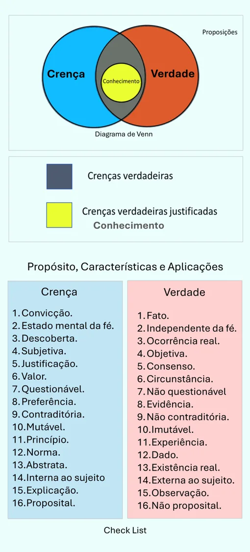 O esquema composto pelo Diagrama de Venn e Check list descrever as relações entre crença, verdade e conhecimento e o processo mental envolvido na “justificação das crenças” … área nuclear da epistemologia, que estuda a filosofia da ciência, métodos e ferramentas para pensar científico, observar, questionar, pesquisar, hipotetizar, testar, validar ou refutar hipóteses e teorias em experiências científicas.