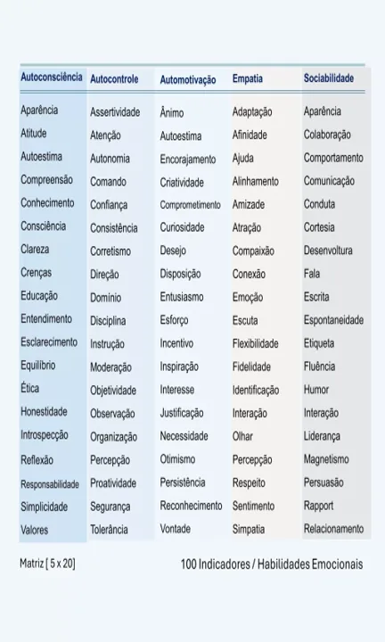 - A matriz relaciona + 100 habilidades, onde cada célula da matriz é um indicador de controle e desempenho emocional.