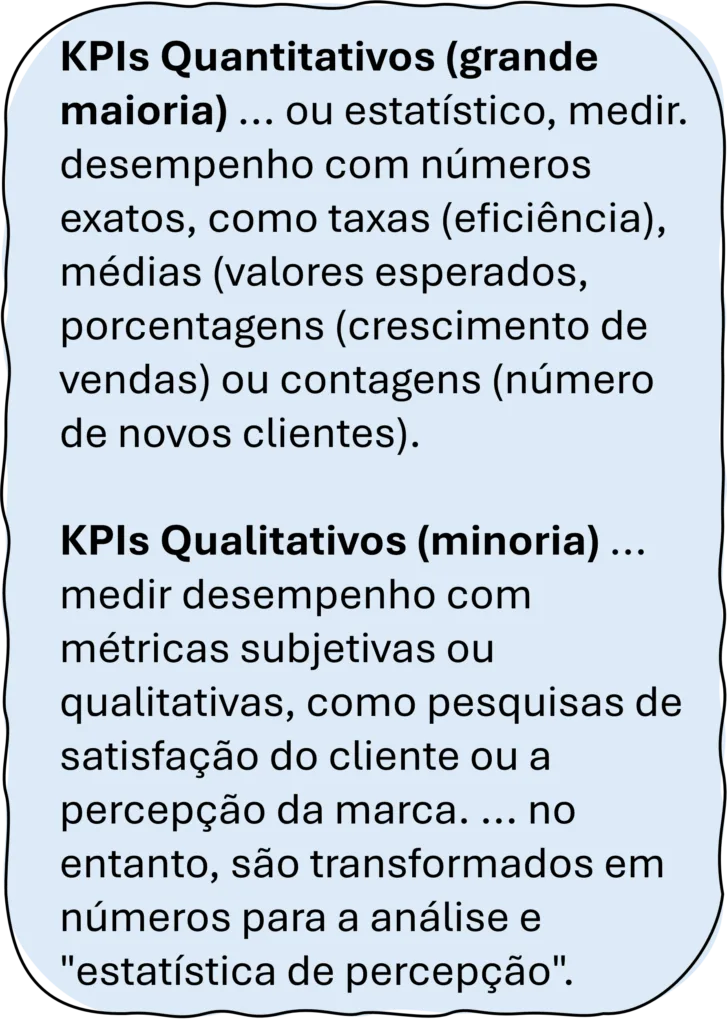 - KPIs Quantitativos/Estatísticos (Maioria) … medem o desempenho com números exatos, como taxas (eficiência), médias (valores esperados, porcentagens (crescimento de vendas) ou contagens (número de novos clientes).