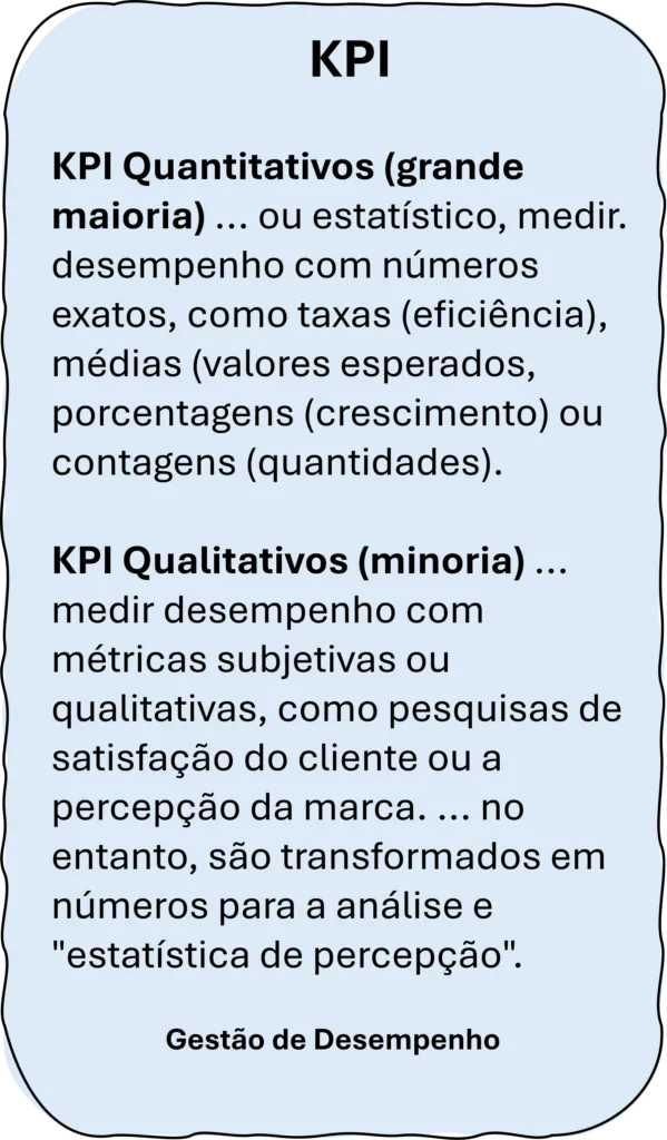 - KPIs Qualitativos (Minoria) … métricas subjetivas ou qualitativas, como pesquisas de satisfação do cliente ou a percepção da marca. … no entanto, são transformados em números para a análise e “estatística de percepção”.