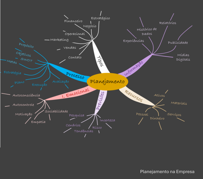O mapa mental da figura destaca conceitos e componentes relevantes do processo de planejamento. É uma referência inicial ou um check list gráfico. Trata-se de “uma imagem que vale mais do que mil palavras”. É uma ferramenta para ensinar, aprender, refletir (pensar profundo), analisar e sintetizar o planejamento ao longo de repetições de práticas espaçadas…