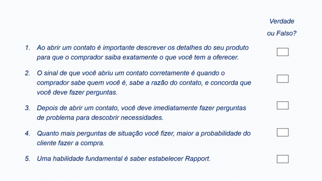 Como devem ser feitas as aberturas de contatos e visitas? Resposta: … Desenvolver Rapport, apresentar você e sua empresa, declarar seu objetivo, e pedir permissão para iniciar a etapa de investigação de necessidades. 1.Falso – Muitas pessoas fazem isso, mas isso não vai ajudá-las a fazer o negócio. Por que você não deve falar sobre seus…