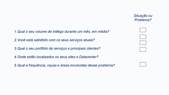 Teste seu conhecimento sobre perguntas investigativas SPIS … Perguntas de Situação investigam fatos e dados sobre a situação do comprador que não sabemos. Perguntas de Problema investigam a natureza e causas de um problema. Perguntas de de Implicação avaliam os efeitos de um problema; aumentam a percepção da seriedade do problema e o valor da…