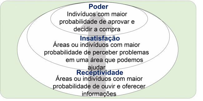 Podemos dizer, numa perspectiva de estratégia de vendas, que uma grande empresa tem 3 tipos de áreas ou grupos de pessoas: áreas de receptividade, áreas de insatisfação e área de poder. Vide figura. Uma boa estratégia de vendas acessa a área de receptividade, para acessar a área de insatisfação e chegar ao poder = centro…