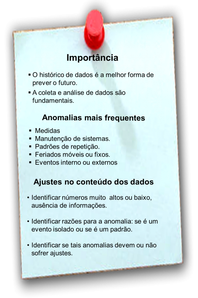 Quais são anomalias mais frequentes e como devem ser tratadas? As anomalias mais frequentes nos dados são: erro nas medidas e geração de dados, padrões de repetição, feriados e eventos O histórico de dados é o ponto de partida para qualquer previsão (forecasting) . A qualidade de previsões, análises e decisões depende de um histórico…