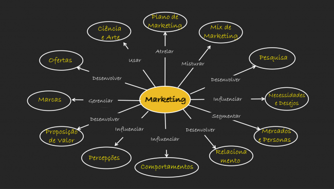 Vide figura. Este é um “guia rápido de marketing” que destaca vários “conceitos chave”. Serve como referência para revisões programadas sobre marketing. Definições de Marketing. Existem várias definições de marketing. Exemplo 1. “Um conjunto de atividades para criar, planejar, desenvolver, comunicar e vender ofertas para satisfazer necessidades do consumidor e superar a concorrência”. Exemplo 2.…