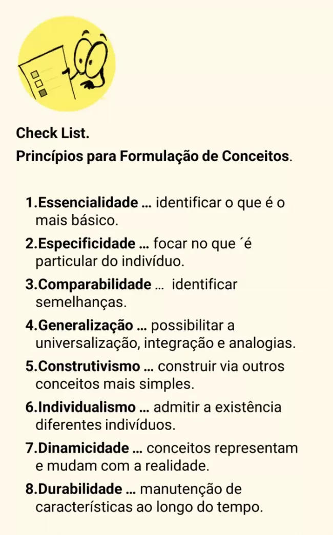 Esses check list tem como propósito ajudar a compreender o que é conceito, suas propriedades e funcionalidades. Conceito é uma ferramenta essencial para a a filosofia, arte, ciência, cognição, modelagem, comunicação, significação e aprendizagem cognitivista e inteligência artificial, dentre outras. Como formular e usar conceitos? Check List. Princípios para Formulação de Conceitos.