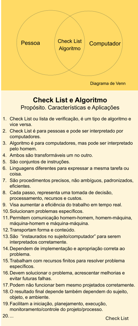 Check List e Algoritmo são farinhas do mesmo saco … O objetivo desse sumário é apresentar o check list “check list-algoritmo” como metaferramenta para comparar essas duas ferramentas.