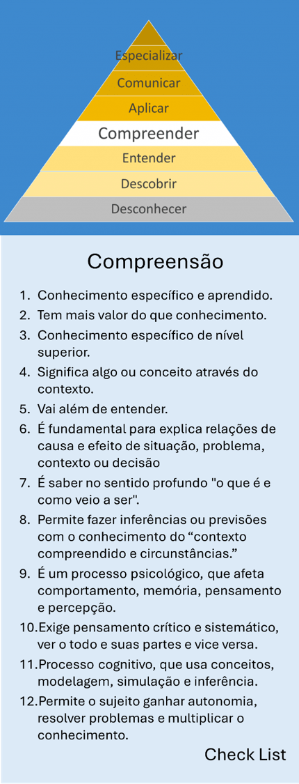 A compreensão envolve uma relação e interação entre sujeito e objeto. É um conhecimento específico de nível superior. É entender o significado de algo através de reflexão sobre relações de causa e efeito entre sujeito e objeto do conhecimento. Compreender possibilita explicar idéias e perspectivas sobre um objeto do conhecimento. É um processo cognitivo que…