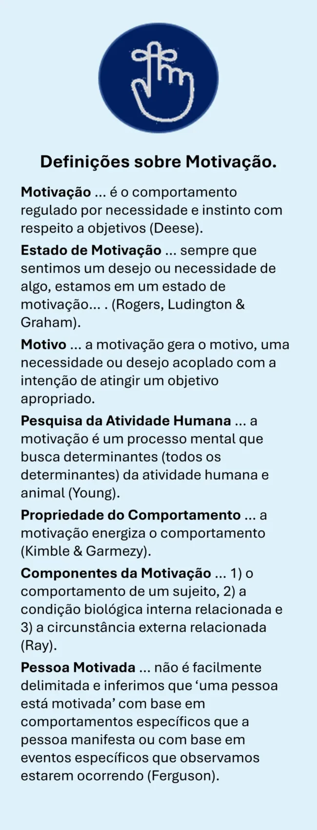 Motivação … é o comportamento regulado por necessidade e instinto com respeito a objetivos (Deese). Estado de Motivação … sempre que sentimos um desejo ou necessidade de algo, estamos em um estado de motivação… (Rogers, Ludington & Graham). Motivo … a motivação gera o motivo, uma necessidade ou desejo acoplado com a intenção de atingir…